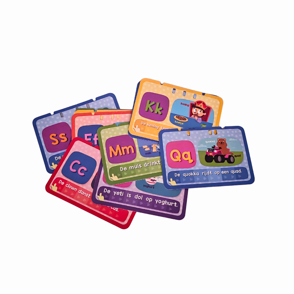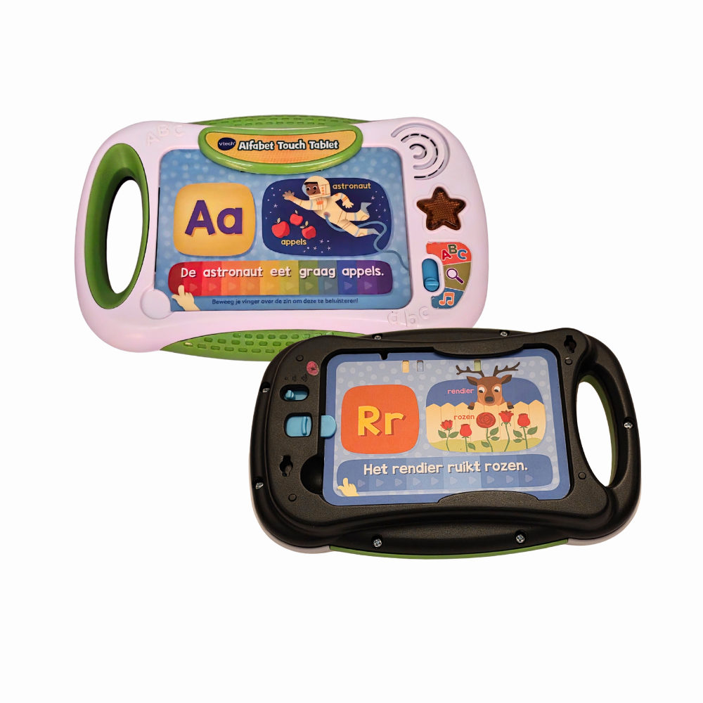 Met de alfabet touch-tablet van VTech maakt je kind kennis met het alfabet, de fonetische letterklanken en woorden. De tablet bevat 13 dubbelzijdige kaarten met op elke zijde een letter van het alfabet die je in de tablet schuift. Door met een vinger te tikken of te vegen activeer je meer dan 700 melodieën, liedjes, zinnen en geluiden die allemaal Nederlandstalig zijn ingesproken. Heeft je kind alle kaarten doorlopen dan is hij klaar om de quiz te spelen. Dit spel bevordert het zelfstandig spelen en vergroot de woordenschat.