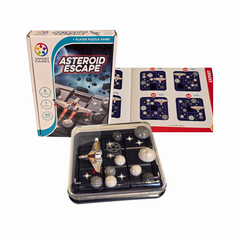 “Asteroid Escape” is een schuifpuzzel uit een ander universum, met 60 opdrachten van makkelijk tot razend moeilijk.