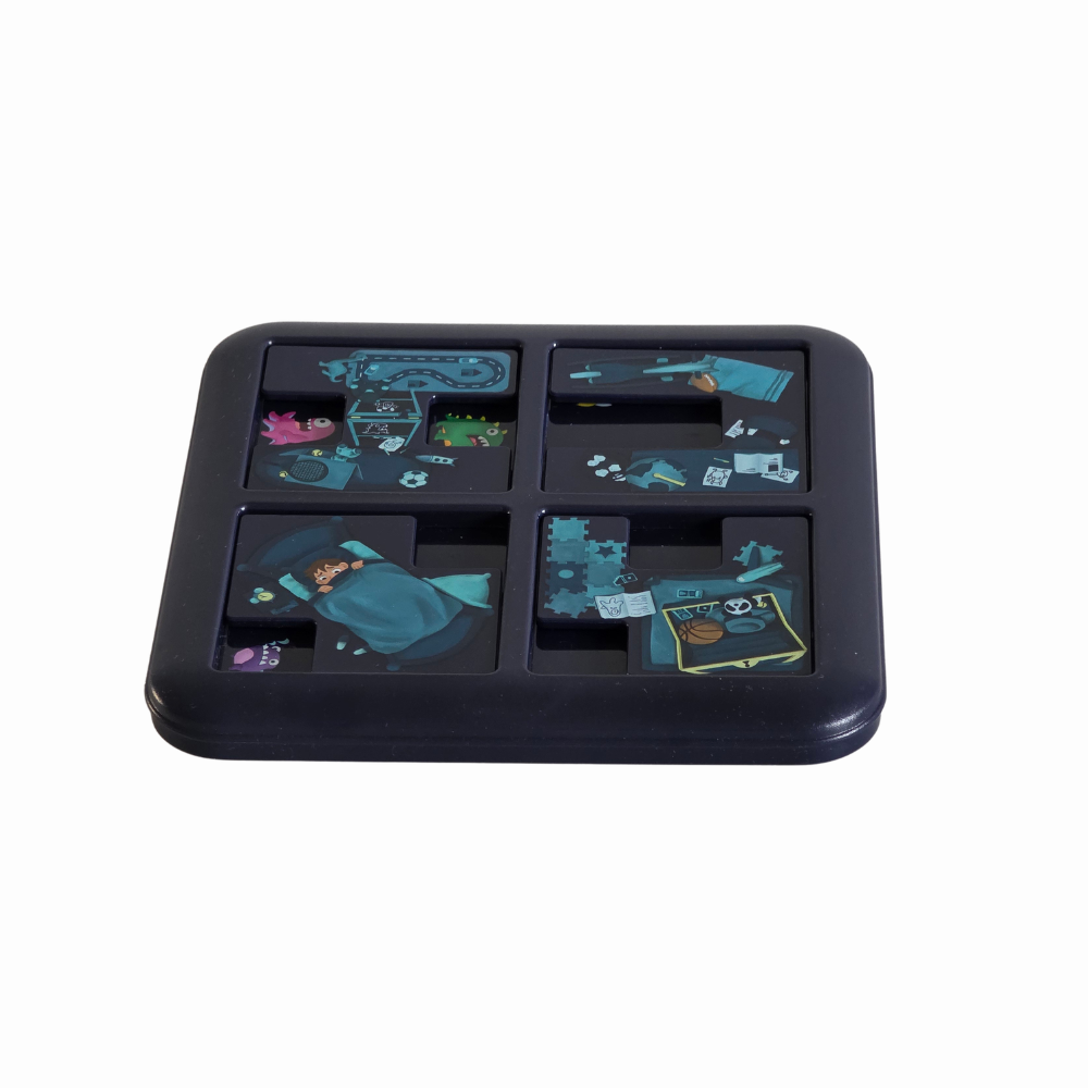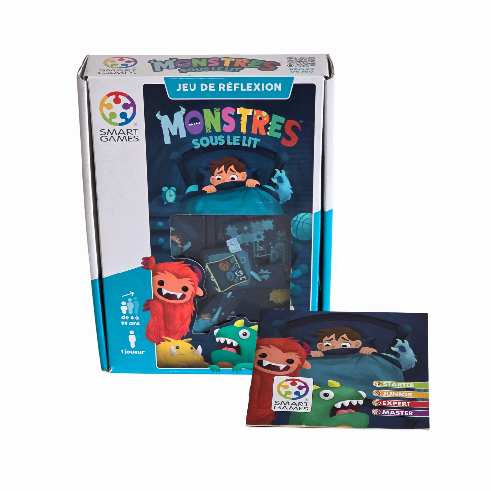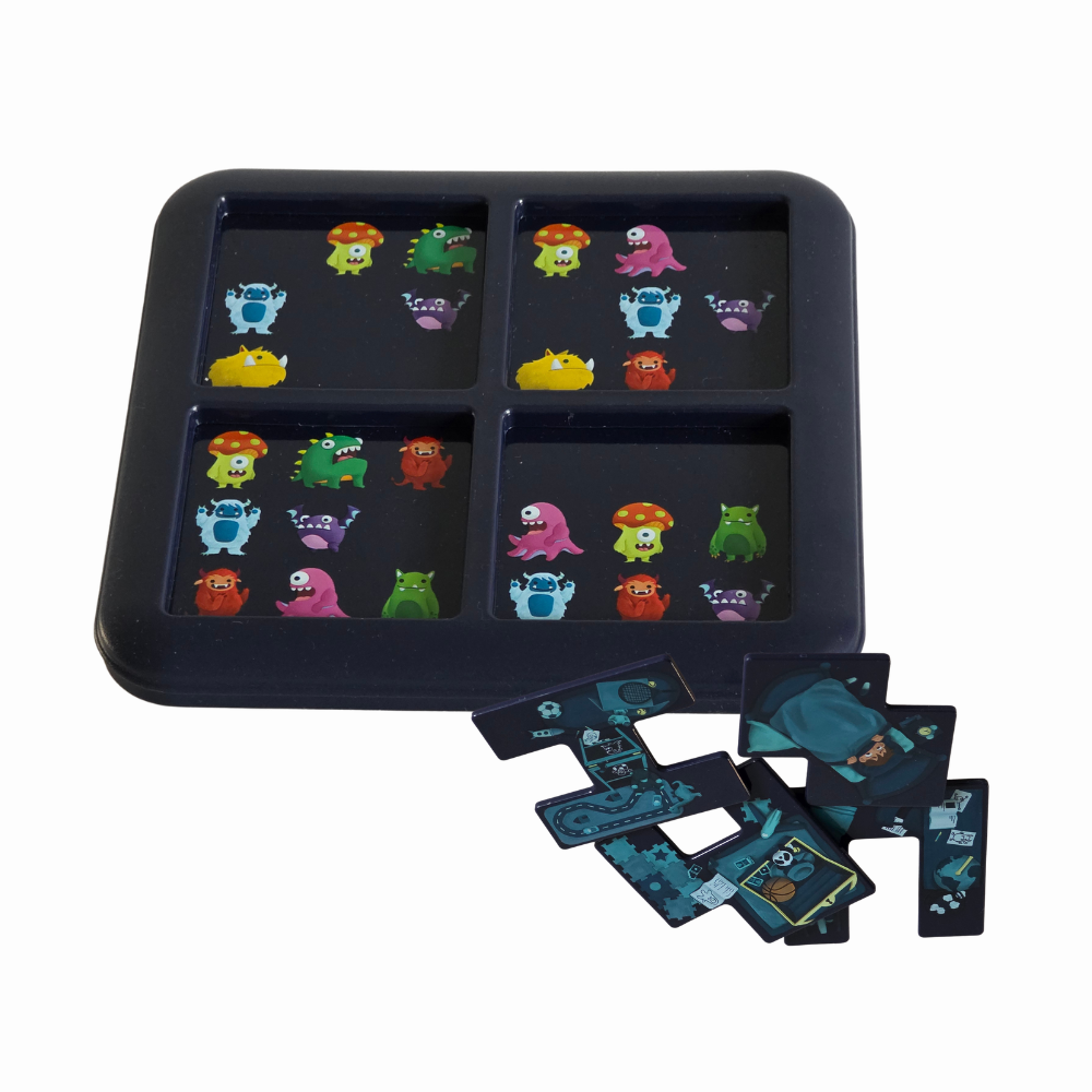 Plaats de 4 puzzelstukken op het spelbord, zodat alle monsters verborgen worden, behalve diegene die in de opdracht afgebeeld zijn. Monsters Hide & Seek is een reisspel met 60 opdrachten, van makkelijk tot moeilijk.
